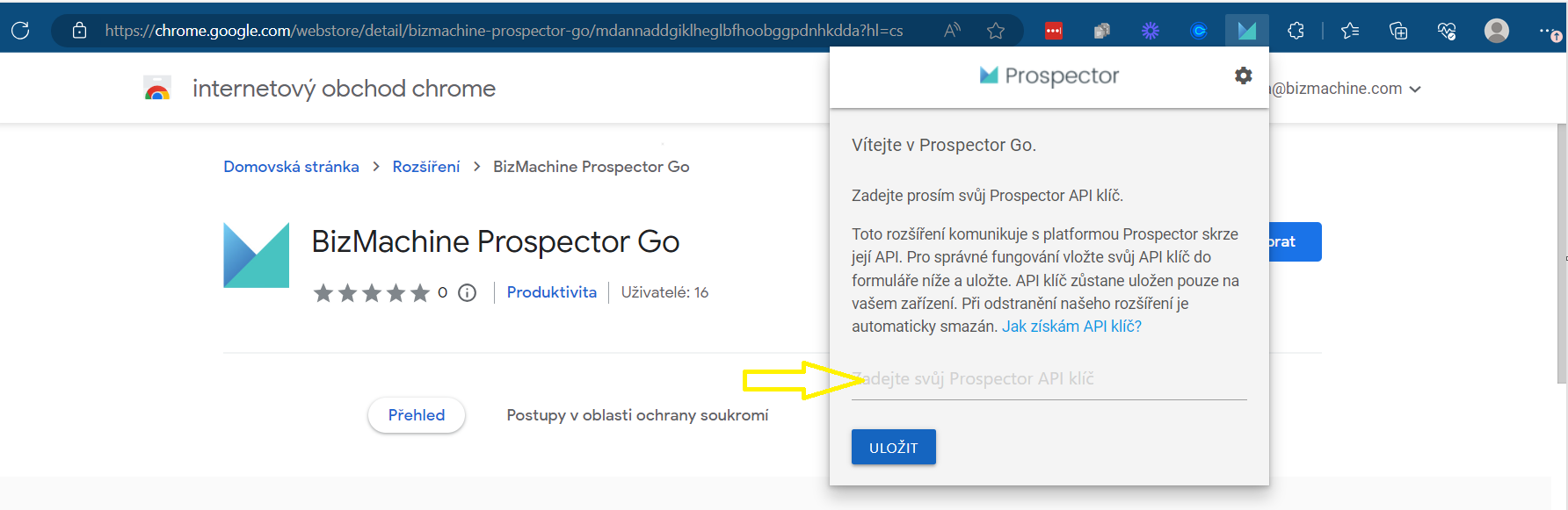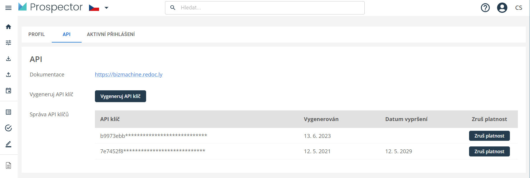 Jak si vygeneruji API klíč? API klíč si můžete vygenerovat přímo v Prospectoru. Stačí jít do uživatelského nastavení - ikonka Profilu (v právém horním rohu) -> Nastavení -> API. (Pokud v nastavení sekci “API” nevidíte kontaktujte prosím support@bizmachine.com) Zde můžete kliknout na tlačítko “Vygeneruj API klíč”. Po kliknutí se zobrazí nově vygenerovaný API klíč. POZOR: API klíč si zkopírujte a pečlivě uložte na bezpečné místo, po opuštění stránky již nebude možné tento API klíč znovu zobrazit.