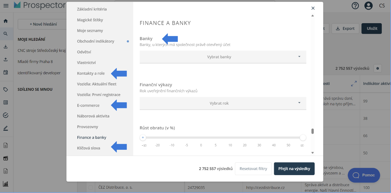 Jak vytvořit nové hledání? (6) Po rozkliknutí sekce Pokročilé filtrování rovnou uvidíte v levém sloupci svá uložená nebo nasdílená vyhledávání. Nové vyhledávání zahájíte volbou "+ Přidat filtr". (7) Zde jsme si pro Vás připravili další novinky. Kromě kritérií, které už znáte, můžete nově vyhledávat dle klíčových slov, bank, e-commerce nebo kontaktů ( v závislosti na Vaší smlouvě). Po vybrání vhodných parametrů se Vám zobrazí personalizovaná tabulka dle Vašich preferencí. Ty si můžete nastavit přes ozubené kolečko vpravo nad tabulkou. (8) Nové hledání si můžete rovnou uložit a pojmenovat (1)