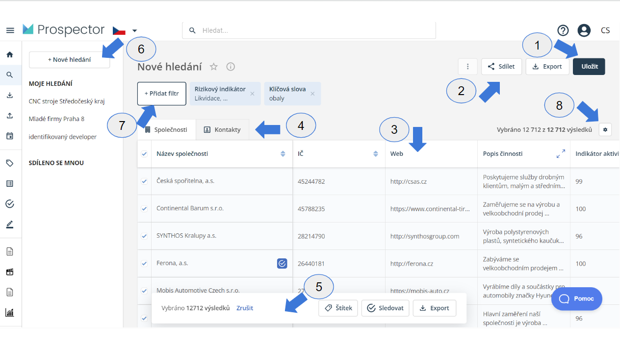 V našem vylepšeném Pokročilém filtrování máte nově možnost ukládat si své vyhledávání (1) a sdílet je s kolegy. (2) Kdykoliv se tedy můžete podívat, jestli nějaké další společnosti splňují Vaše uložená kritéria. Další velkou změnou je také možnost personalizovat si sloupce výsledků, které Vás zajímají. (3) Není pro Vás tak důležitý obrat, ale více Vás u firmy zajímá popis činnosti? Teď už to není problém 🙂