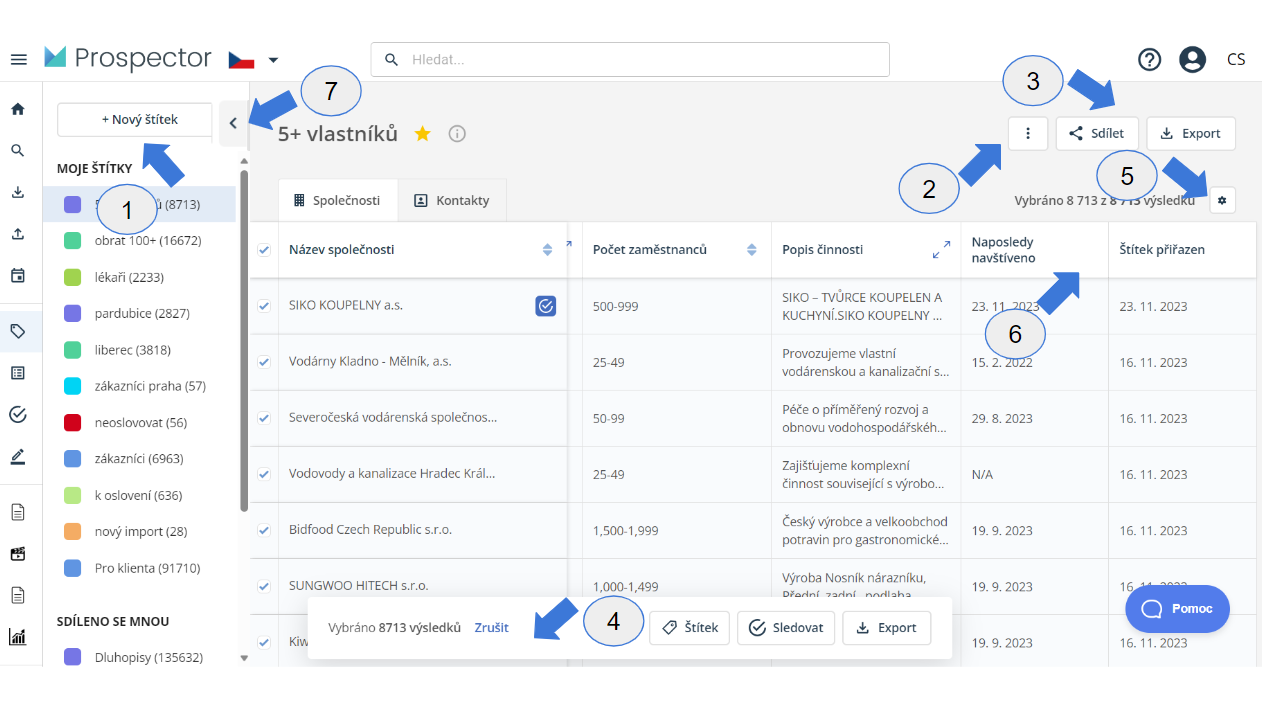 Další změny proběhly i v oblíbené sekci štítky. Nově vidíte všechny své štítky (1) a můžete mezi nimi překlikávat. Zároveň je můžete přejmenovávat, duplikovat (2) a samozřejmě Sdílet (3). Navigační lišta pro akce se zobrazí po označení firem hned dole (4). Stejně jako o Pokročilého filtrování si nyní můžete personalizovat sloupce v tabulce (5), aby se Vám zobrazovalo pouze to, co je pro Vás důležité. Zároveň si můžete zobrazit, kdy jste firmu přidali do daného štítku nebo kdy jste ji naposledy zobrazili (6) A pokud těchto sloupců chcete vidět více najednou, stačí jednoduše sbalit lištu se všemi štítky a rázem máte více prostoru (7)