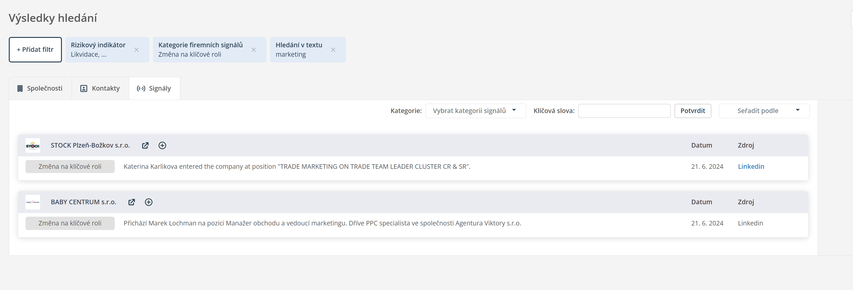 Příklad: "Najdi všechny firmy, kde se změnila klíčová role v managementu na pozici marketingu".