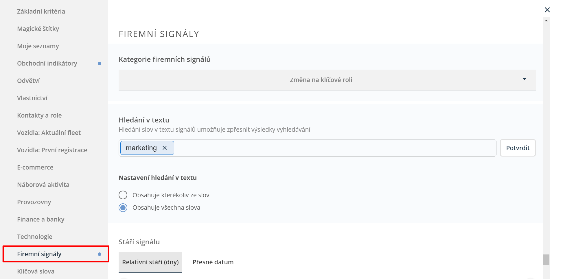 V pokročilém filtrování najdete novou kategorii Firemní signály.